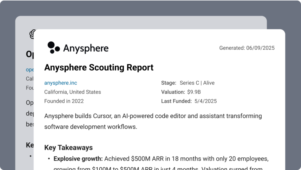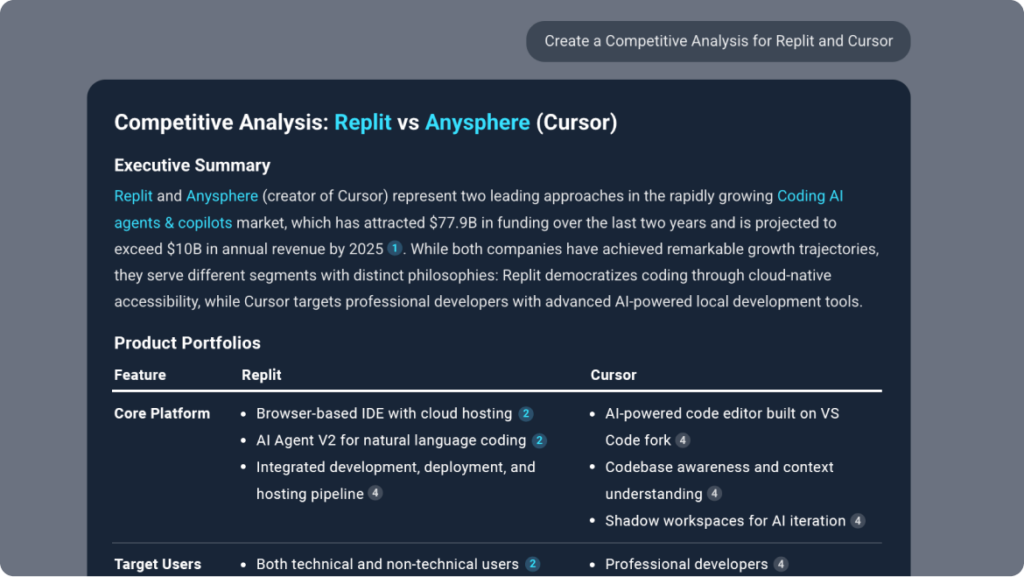 Generates instant analyst-grade strength, weakness, opportunity, and threat analysis on any private company. Presentation-ready.