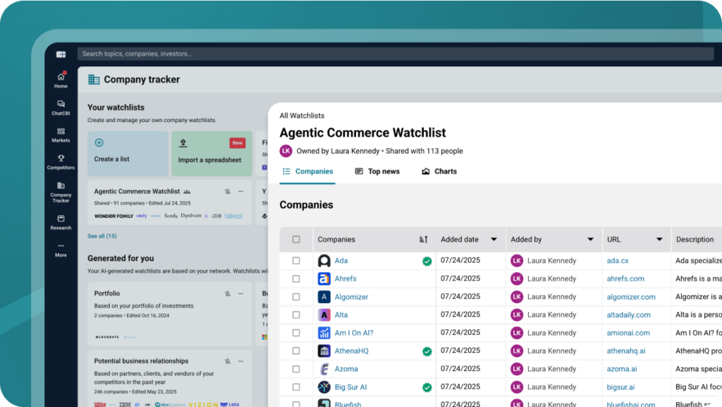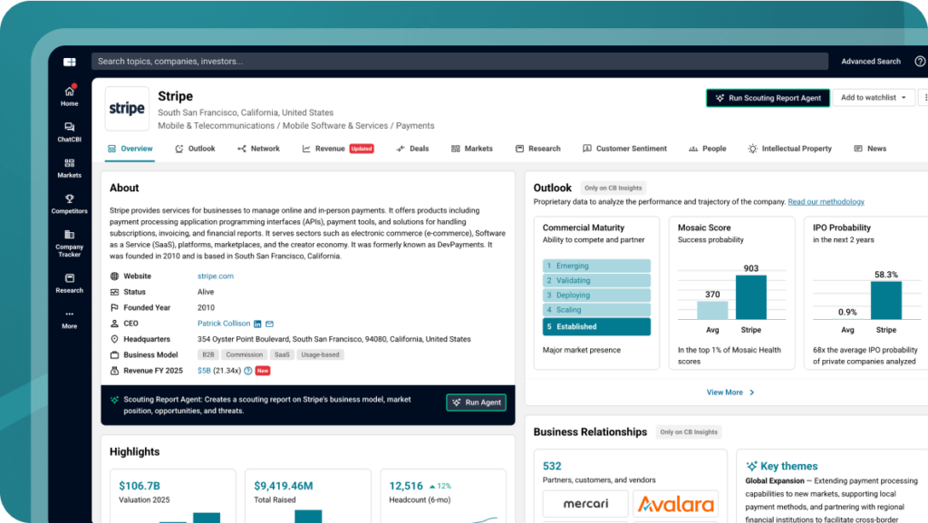 Programmatic access to CB Insights’ proprietary data — fueling your internal models, dashboards, and AI copilots with structured, validated context no generic LLM can match.