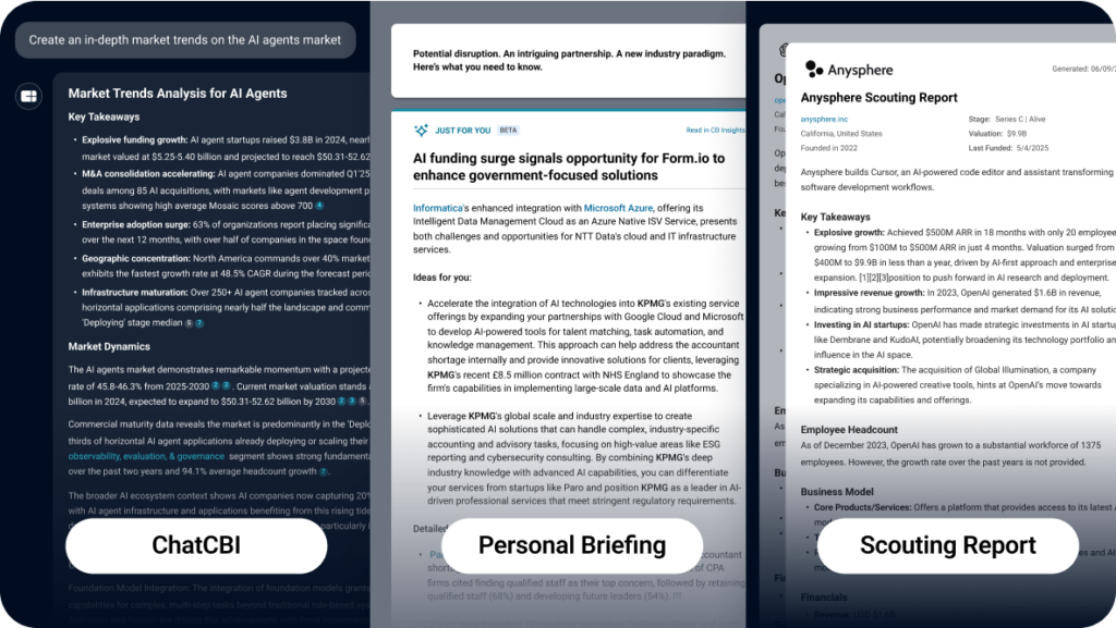 Our purpose-built AI agents translate predictive signals into the exact outputs your teams need — from market maps and scouting reports to competitive briefs.